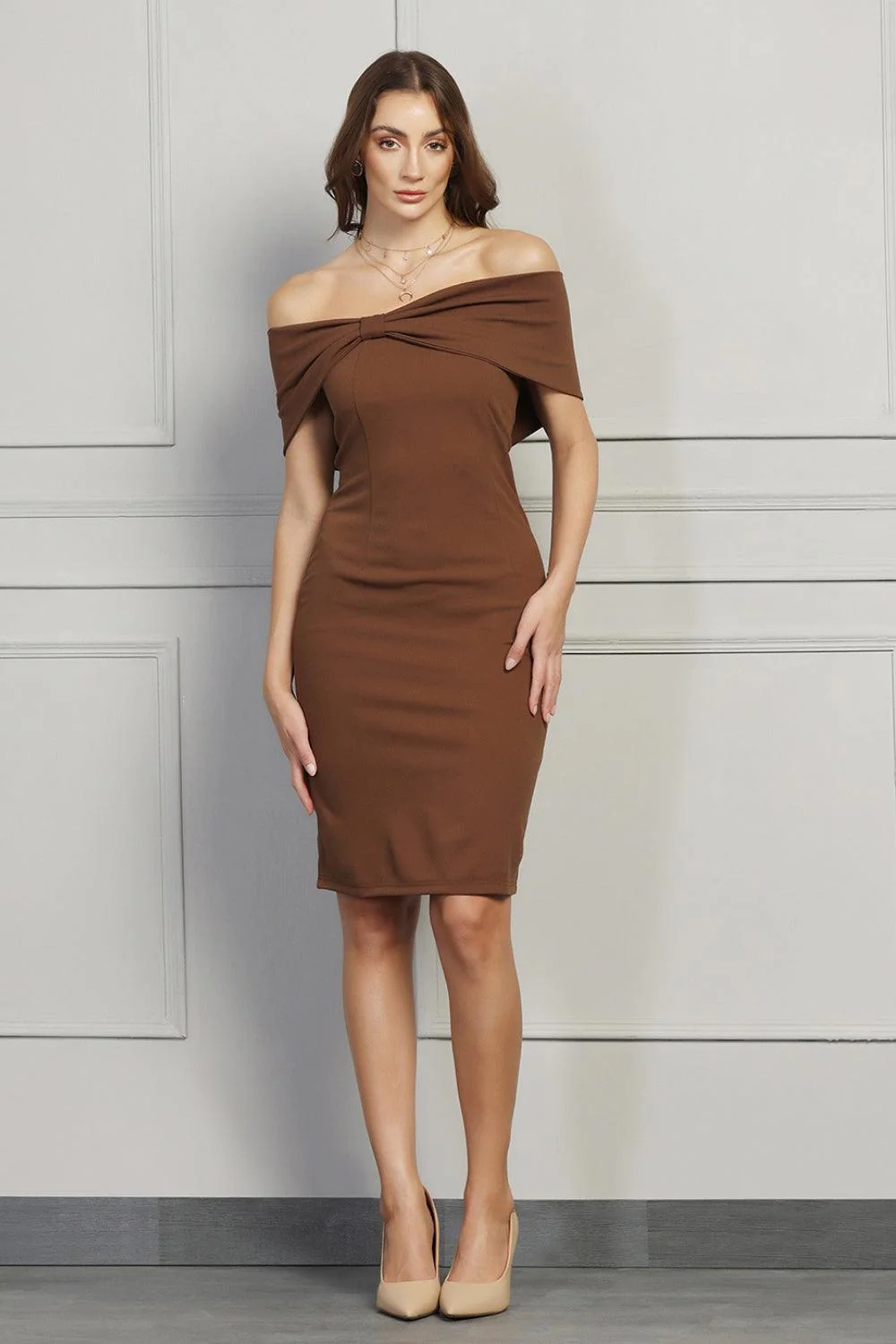 Product Details : Whether you’re on a romantic date night or sipping cocktails with the girls, our Chocolate brown midi dress is everything. Made from a crepe fabric that’s both supportive and sculpting. Sure to turn heads at any formal event from birthdays to baby showers, this bodycon dress features a Bardot neckline wrapped by a large bow and a split fitted skirt.