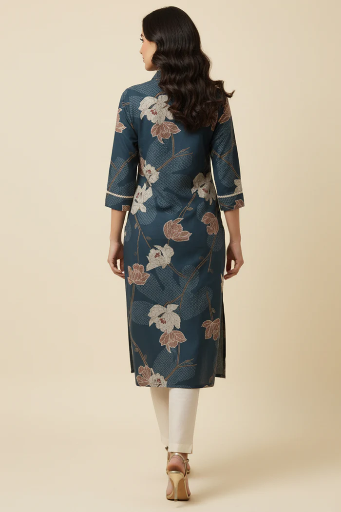 Beautiful Dark Blue Pure Cotton Kurti Featuring Straight Silhouette with Floral Prints