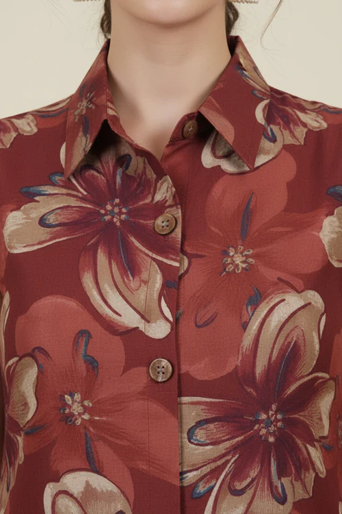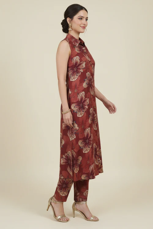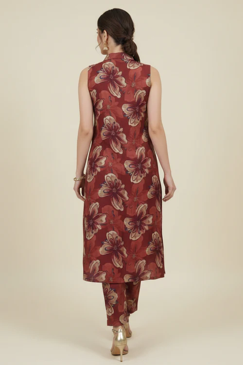 Beautiful Maroon A-Line Co-Ord Set with Floral Printed Detailing in Viscose Blend