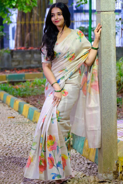 Beige Art Silk Saree Featuring Graceful Floral Motifs