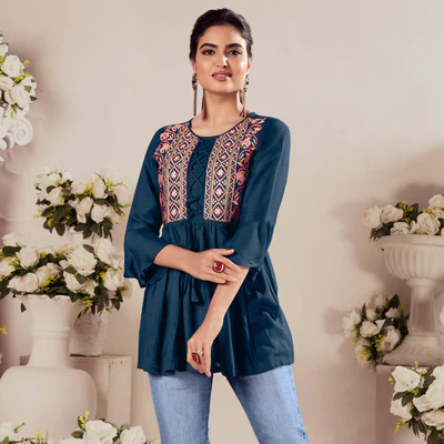 Blue Casual Wear Embroidered Rayon Top