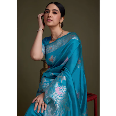 Blue Floral Design Woven Banarasi Silk Saree