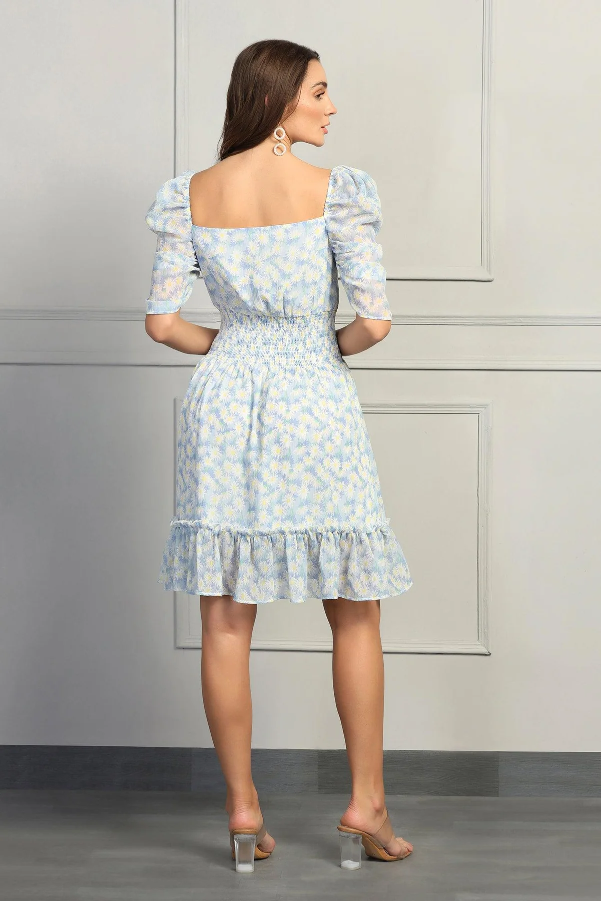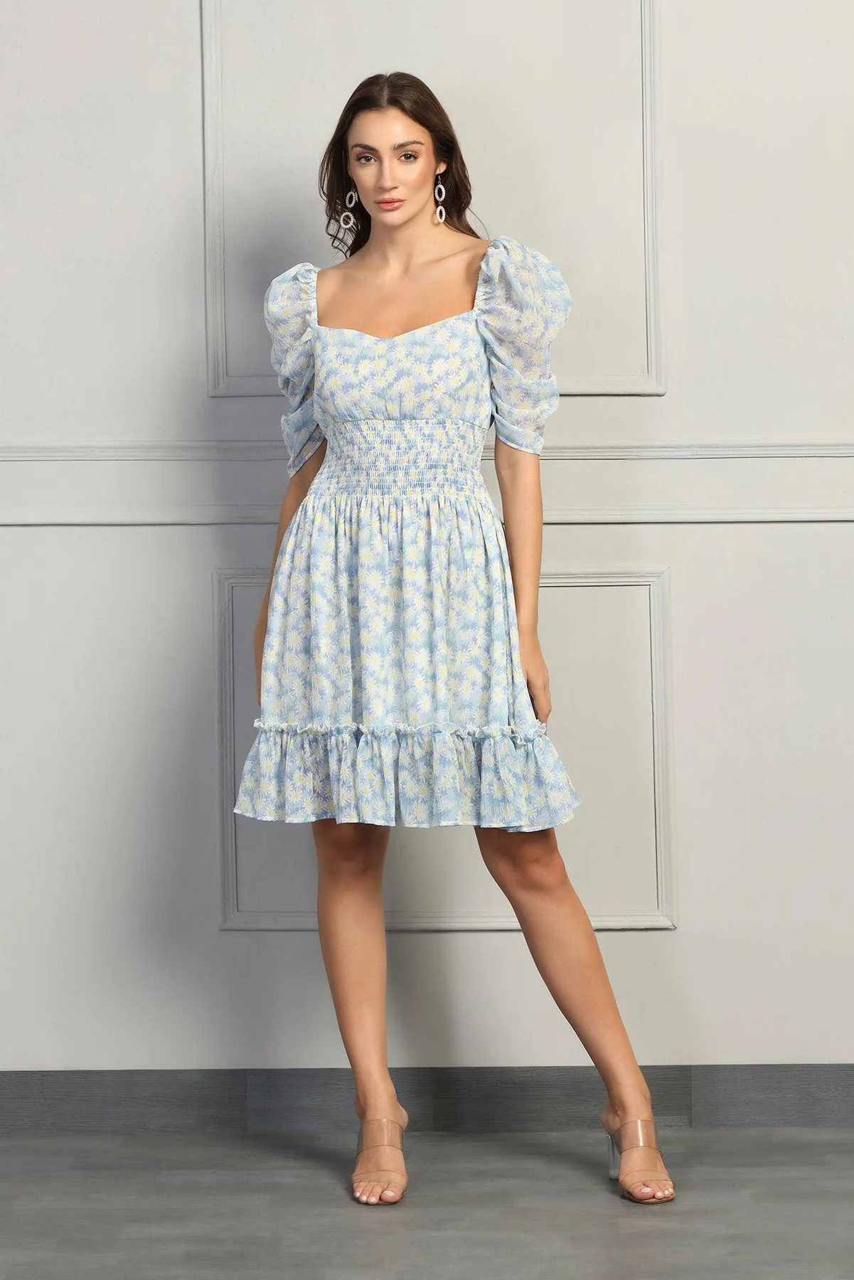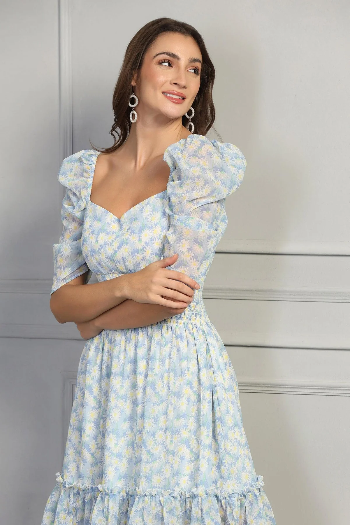 Styling Tip: Elevate the whimsical charm of your blue floral puff sleeve dress by adding delicate accessories. Opt for dainty gold jewellery and nude heels to complement the chiffon fabric. Complete the look with loose, romantic waves in your hair for a soft and feminine touch