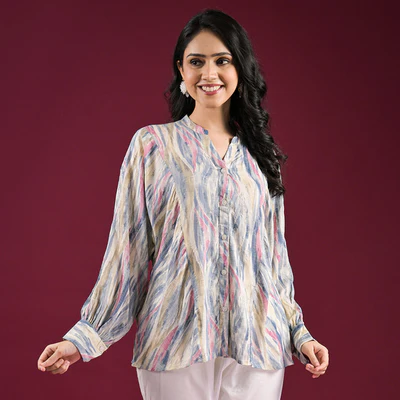 Blue Foil Printed Chanderi Silk A-Line Top