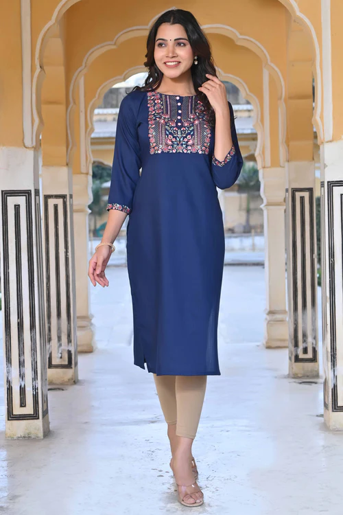 Blue Yoke Embroidered Rayon Slub Straight Kurti