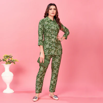 Bottle Green Floral Printed Chanderi Co Ord Set