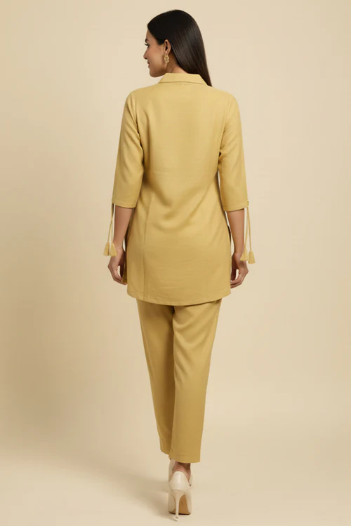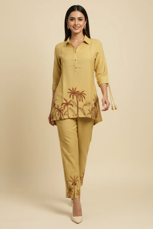 Butter Yellow Thread Embroidered Cotton Blend Top bottom set
