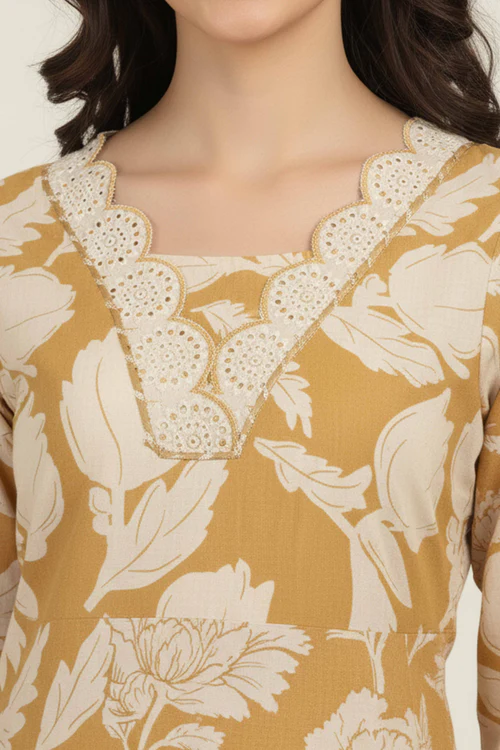Charming Mustard Pure Cotton Floral Printed Co-Ord Set With Graceful Lace On Neckline & Sleeves