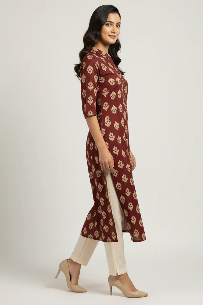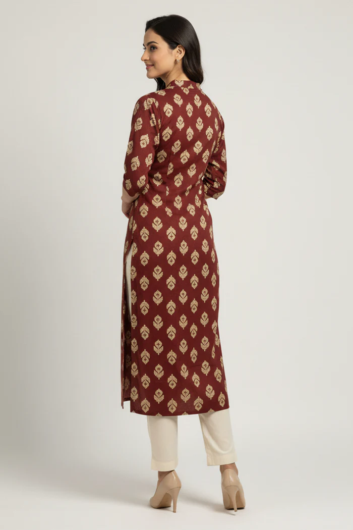 Maroon Printed Rayon Kurti in Flattering A-Line Fit