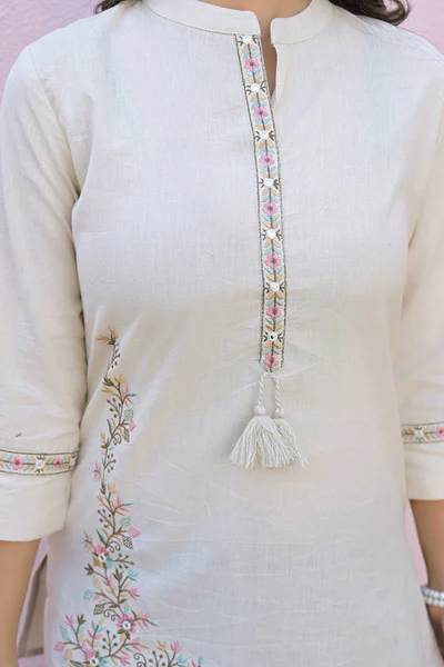 Cream Pure Cotton Straight Top with Elegant Floral Embroidery