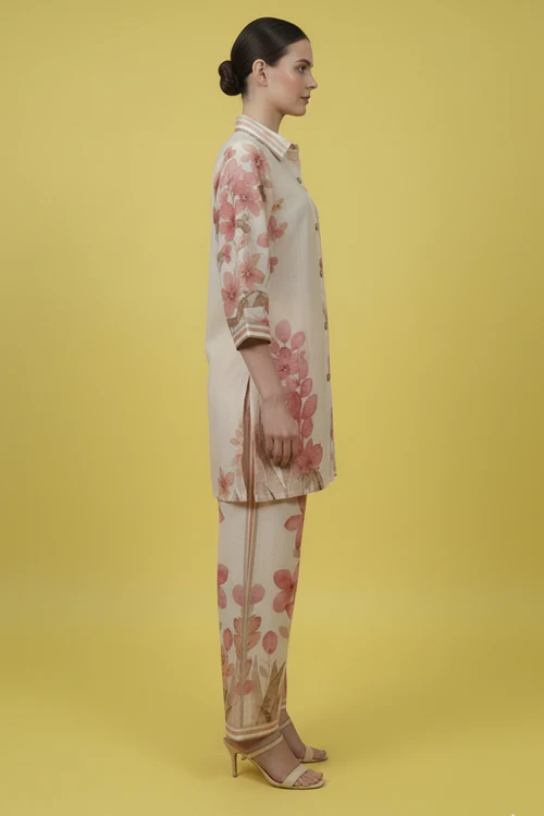 Cream Trendy Muslin Co-Ord Set with Eye-Catching Digital Floral Patterns