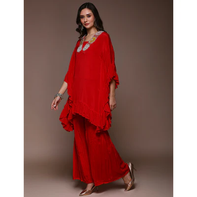 Crimson Red Embroidered Kaftan Style Chinon Co-Ord Set