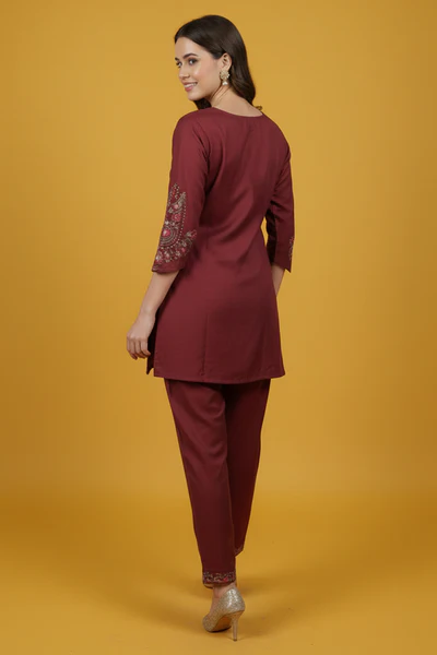 Designer Dark Mauve Floral Embroidered Top Paired with Trousers Co-Ords in Viscose Blend