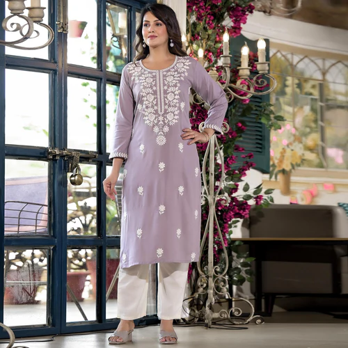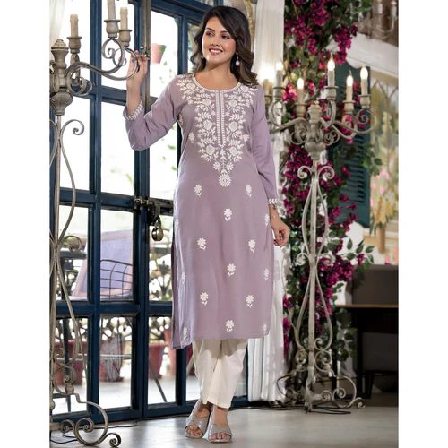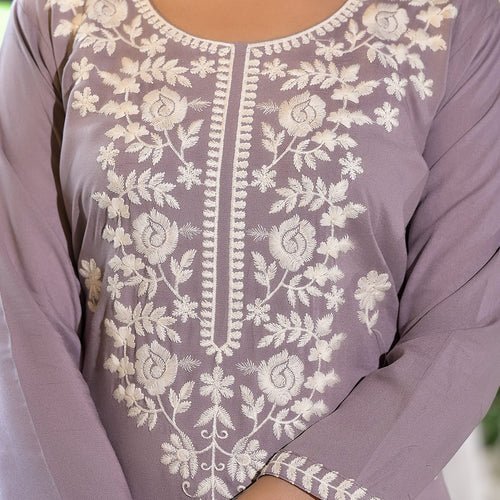 Dusty Lavender Floral Embroidered Rayon Straight Kurti