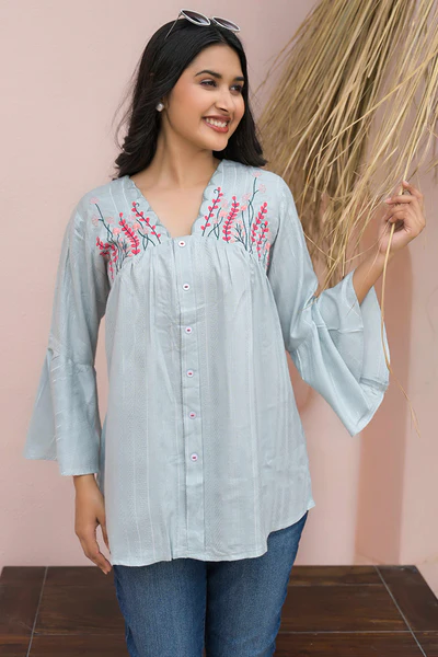 Elegant Light Sky Blue A-Line Cotton Top with Delicate Floral Work