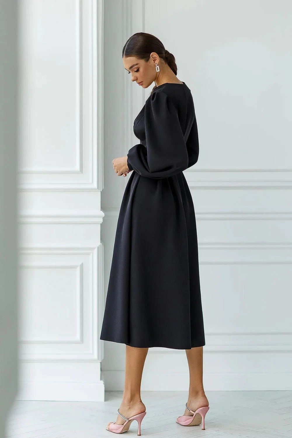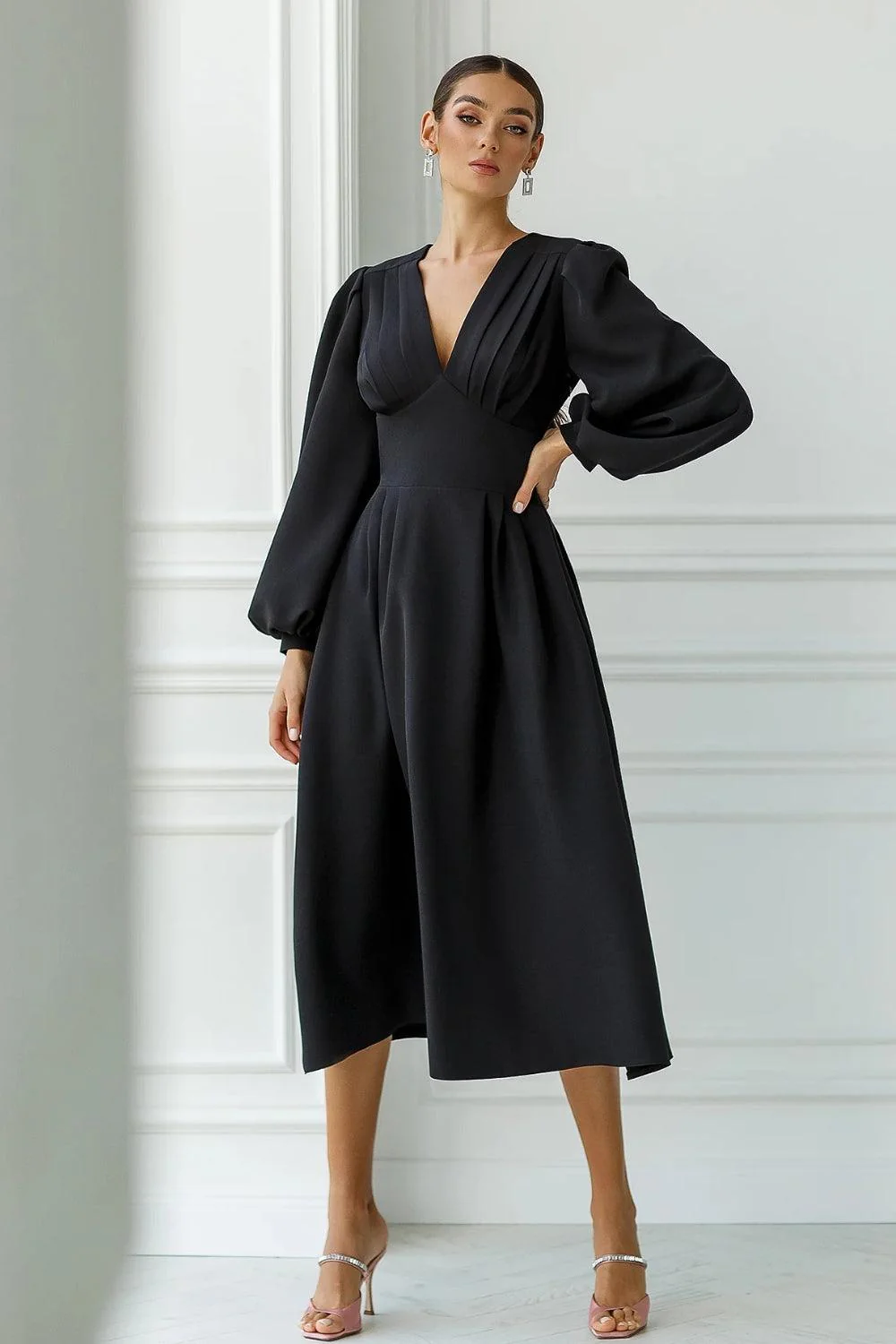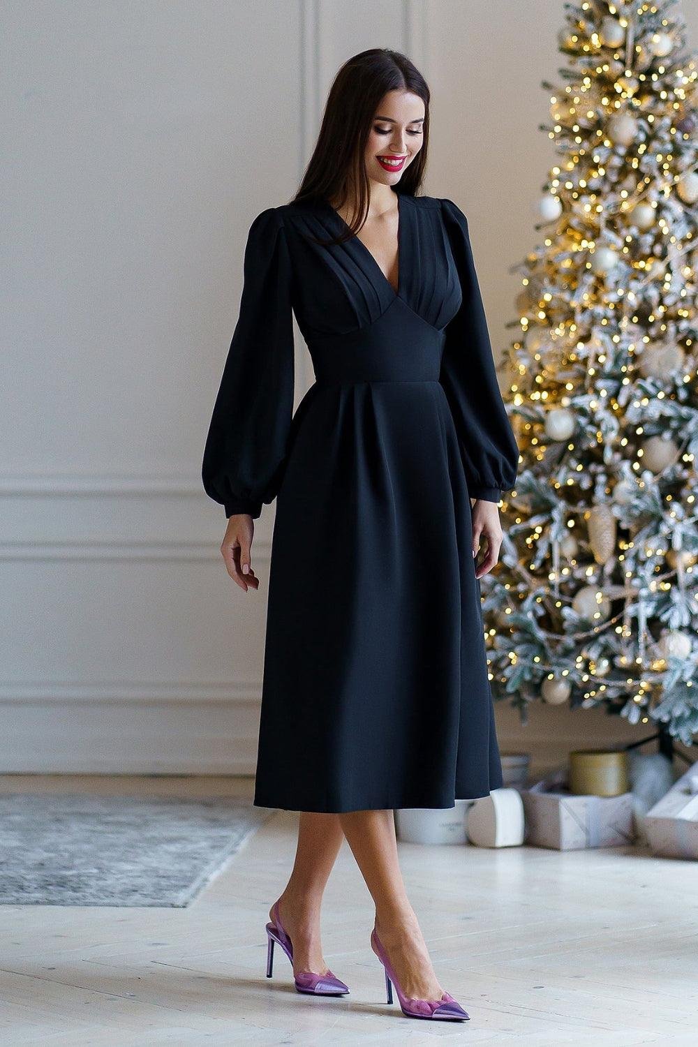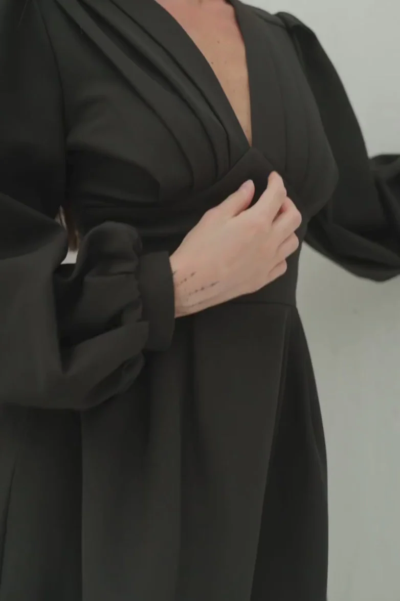 Designed in a luxurious crepe fabric, this Black midi dress is the epitome of sophistication and grace. Featuring a flattering V-neckline, structured pleat detailing, and statement balloon sleeves, it offers a perfect balance of modern style and vintage charm. The flowy silhouette drapes effortlessly, providing a comfortable yet chic fit that works for any occasion.