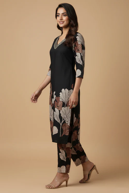 Fashionable Black Pure Cotton Top Bottom Set Highlighted with Vibrant Floral Patterns