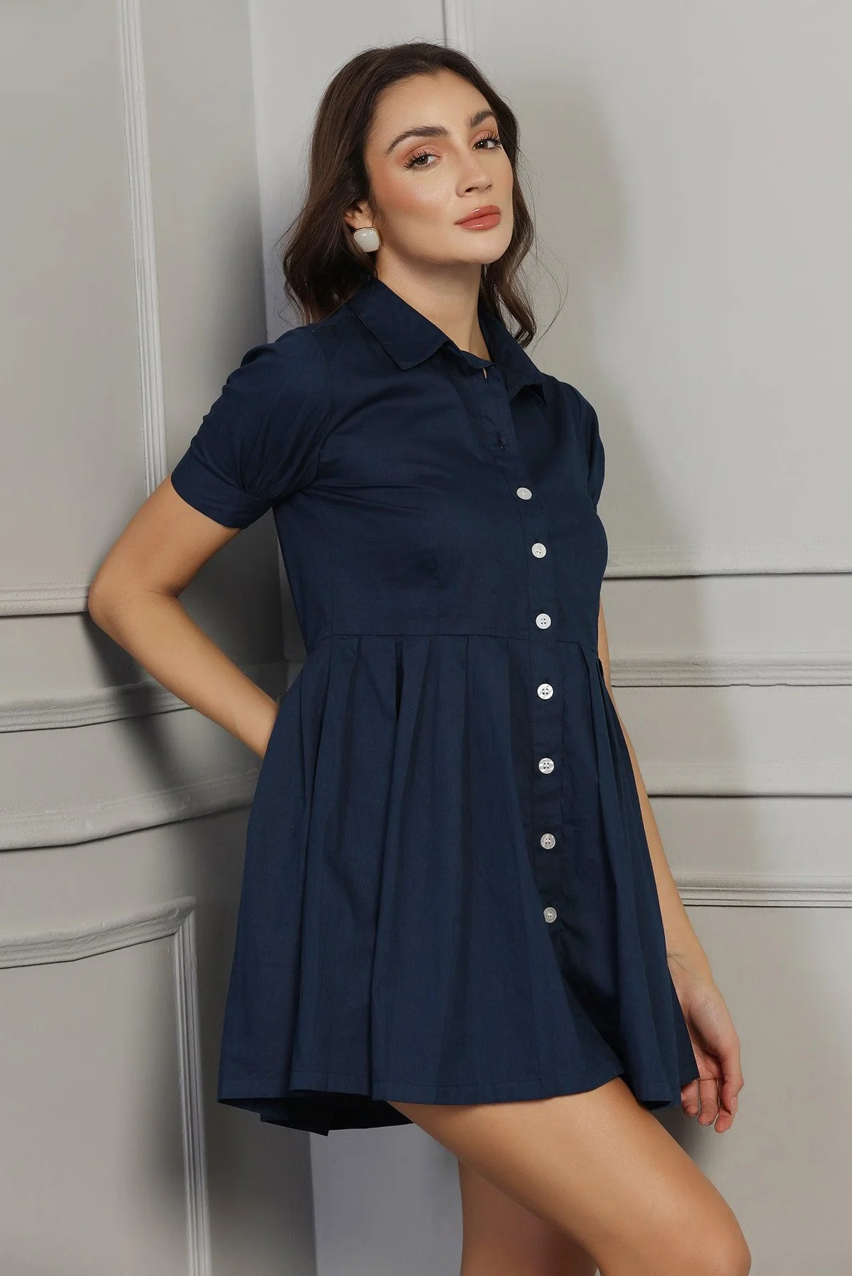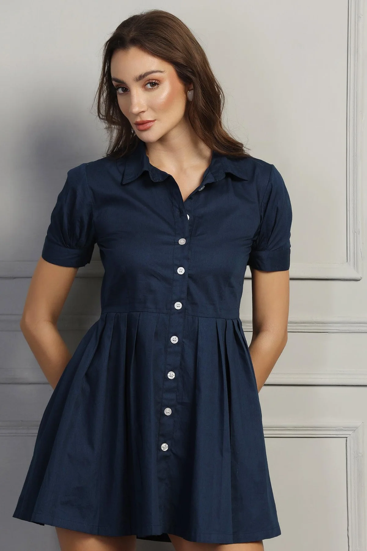Flare Button-Up Mini Shirt Dress : Navy Blue