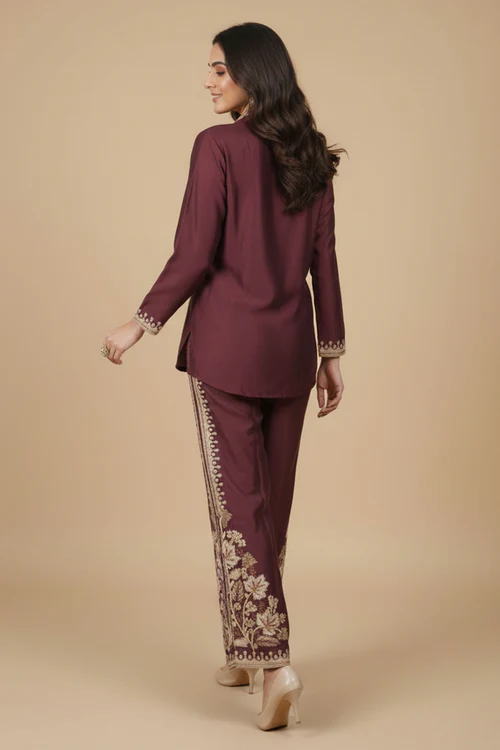 Gorgeous Wine Floral Embroidered Chinon Top Bottom Set for Party and Celebration Styling