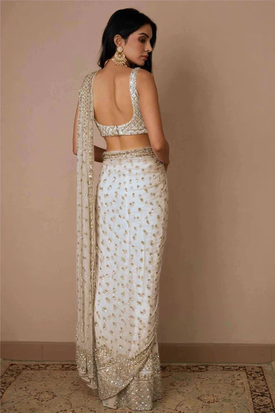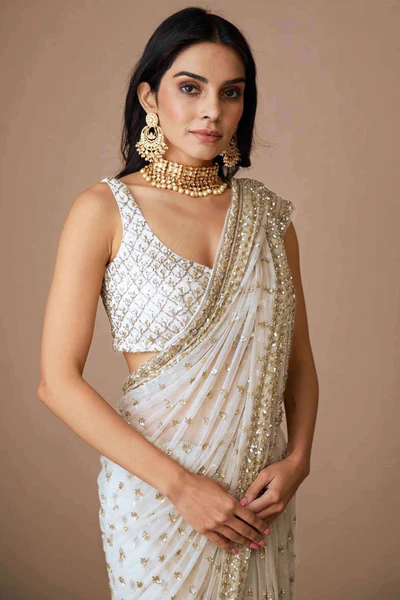 Beige Sequins Embroidered Chiffon Saree
