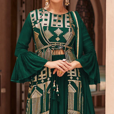 Green Sequins Embroidered Georgette Sharara Choli With Jacket