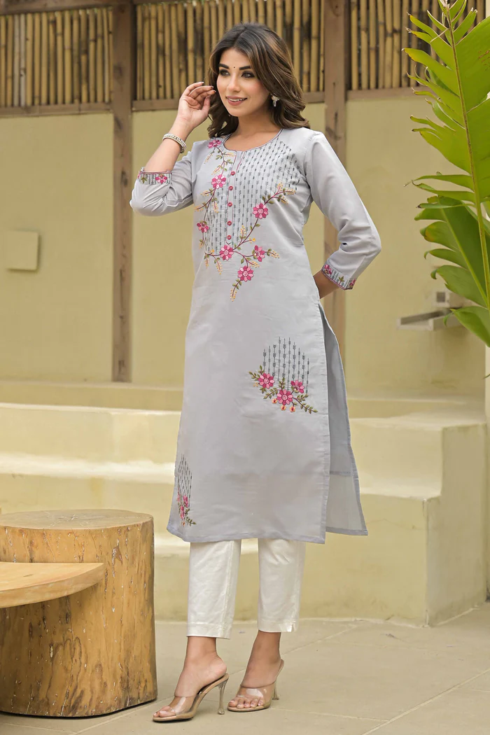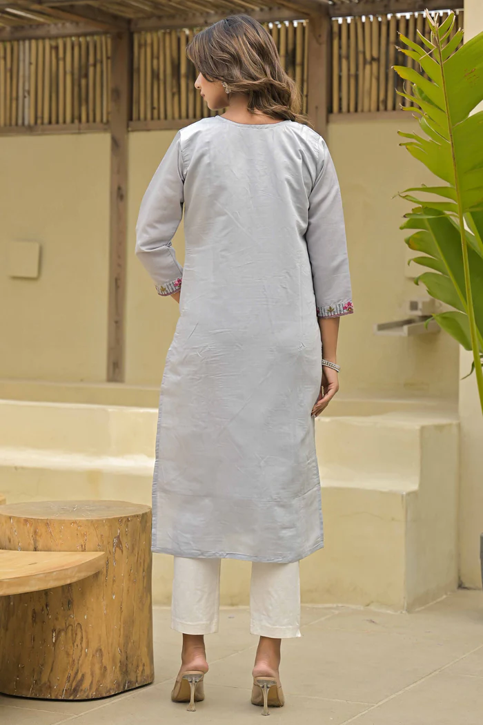 Grey Floral Embroidered Chanderi Straight Kurti With Handwork