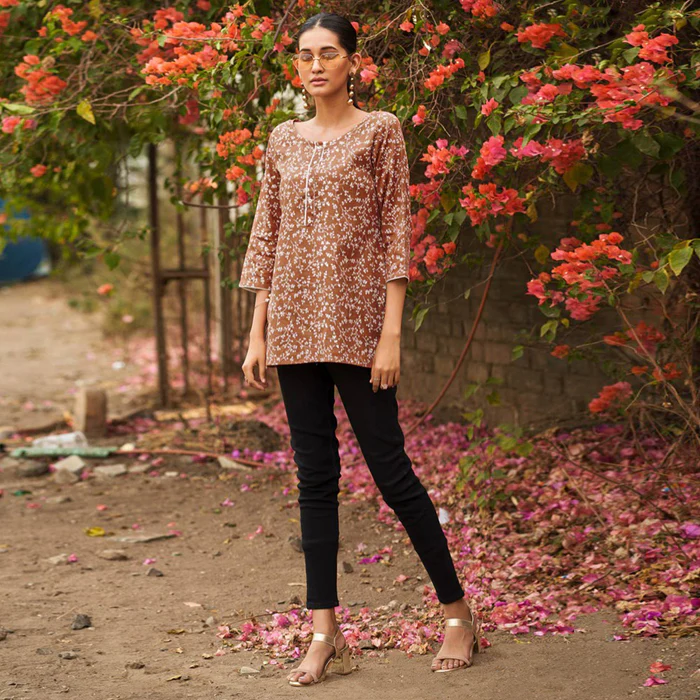 Coffee Casual Wear Floral Embroidered Rayon Top