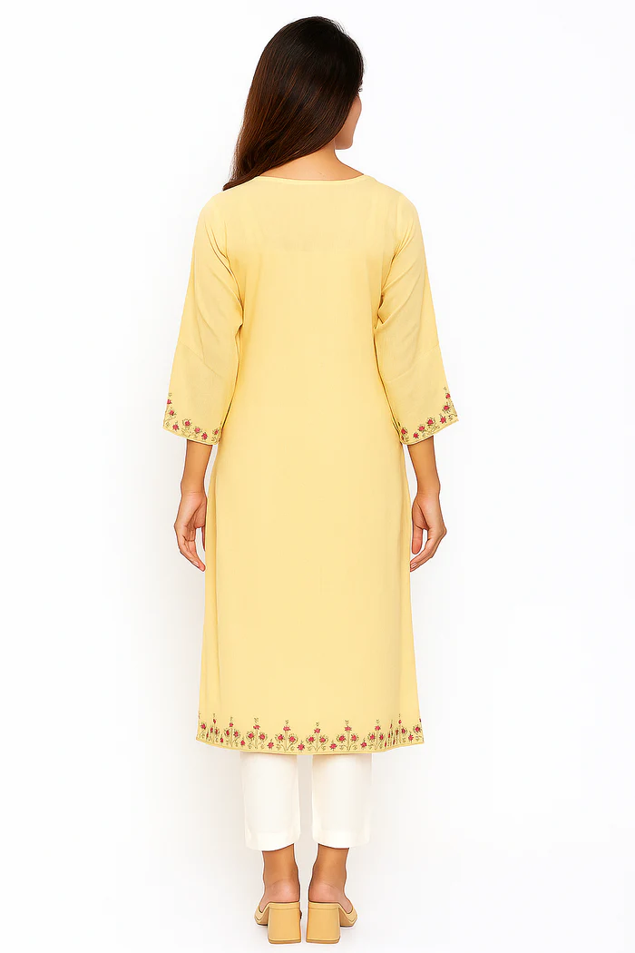Lemon Yellow Rayon Straight Kurti with Heavy Floral Threadwork