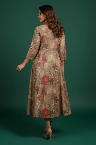Trendy Brown Viscose Blend Midi Dress Featuring All-Over Floral Prints