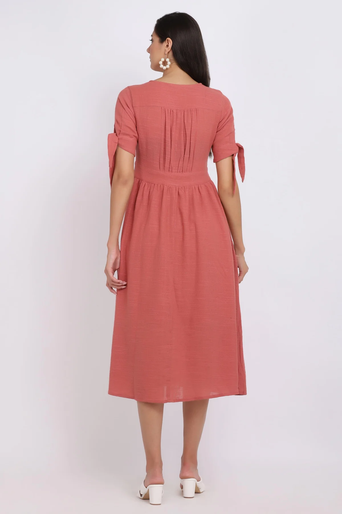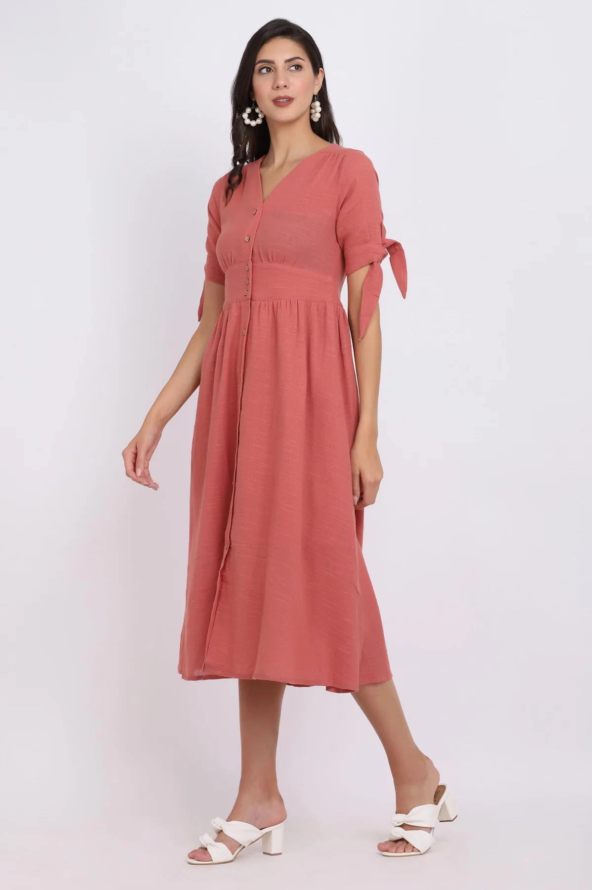 Flare dress with V-neck, empire waist, buttons on the front and self tie short sleeves.