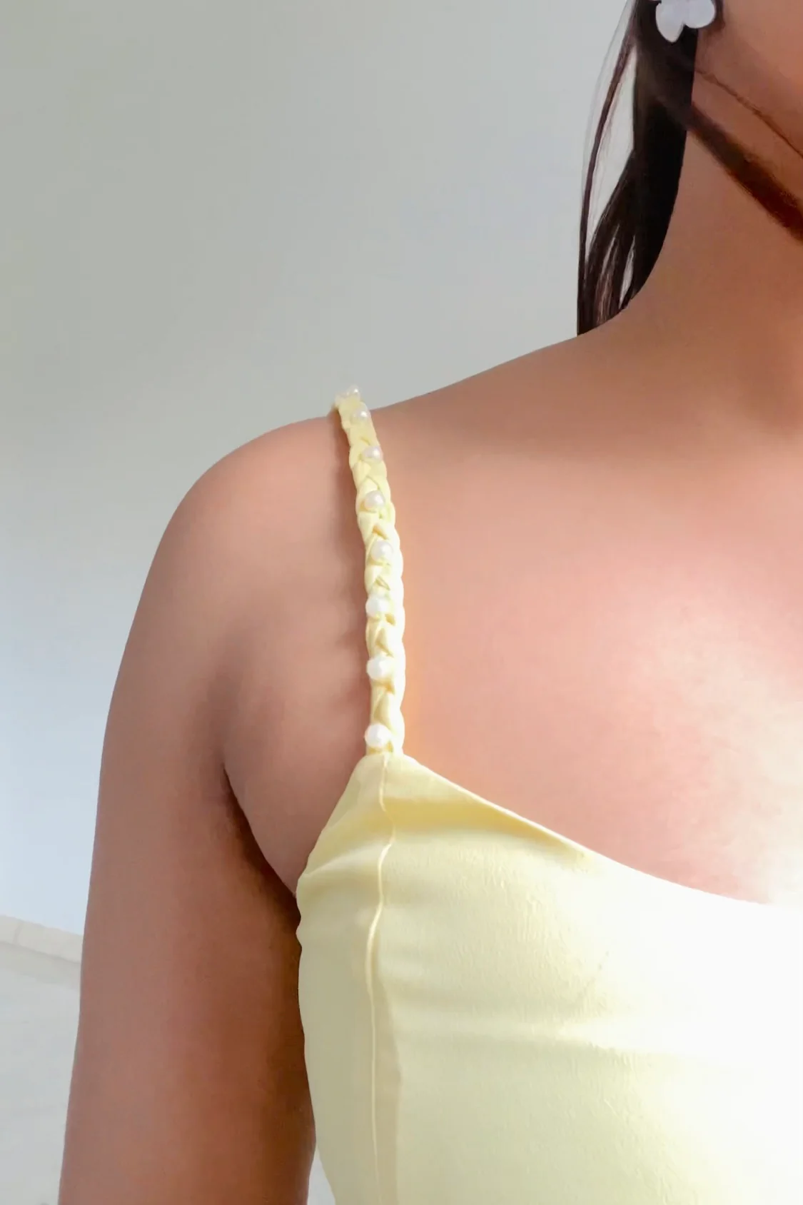 A graceful blend of elegance and comfort. Crafted in premium crepe with a hint of stretch, this dress beautifully drapes the body while giving you effortless movement. Designed with delicate spaghetti straps, a fitted bodice, and a flowy hem with ruffle detailing, it radiates soft femininity and playful charm. Available in two dreamy shades — Butter Yellow and Blush Pink — this dress is made for moments that deserve to be remembered.