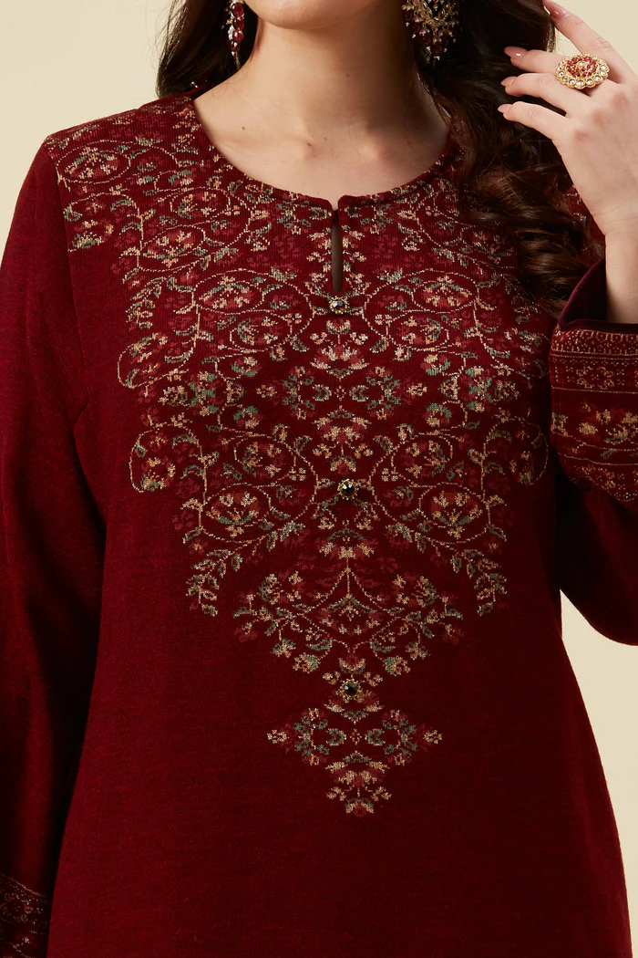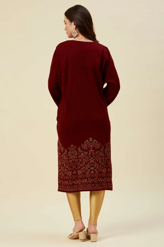 Maroon Floral Woven Woolen Straight Kurti