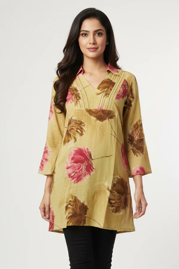 Minimalist Butter Yellow A-Line Top in Pure Cotton Featuring Elegant Floral Prints