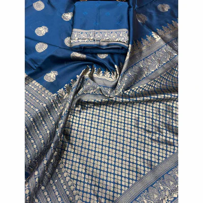Morpich Blue Floral Woven Lichi Banarasi Silk Saree