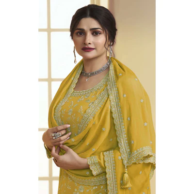 Mustard Floral Embroidered Chinon Semi Stitched Sharara Suit