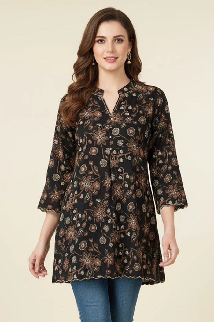 Minimalist Black Pure Cotton Straight Top with All-Over Floral Motifs