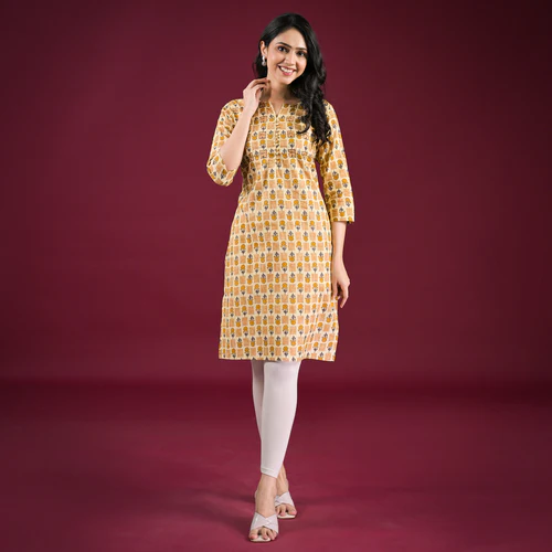 Mustard Floral Printed Pure Cotton Straight Kurti