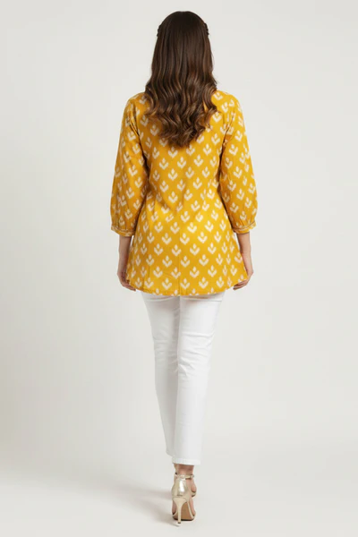 Mustard Timeless Ikkat Printed A-Line Top in Pure Cotton