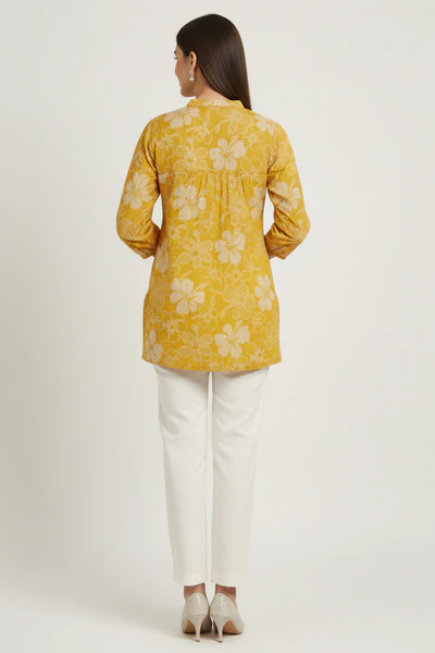 Mustard Viscose Blend Slub Fabric Top with Beautiful Floral Prints