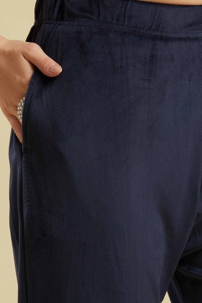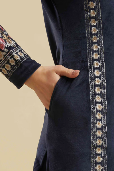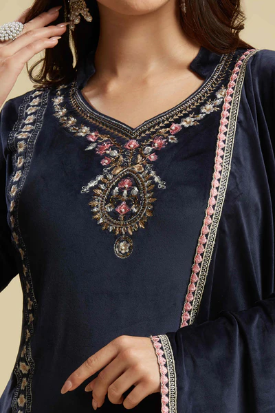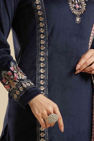 Navy Blue Embroidered Velvet Straight Salwar Suit