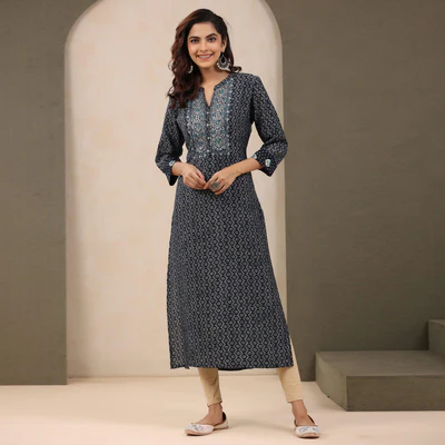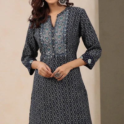 Navy Blue Printed With Embroidered Chanderi Kurti