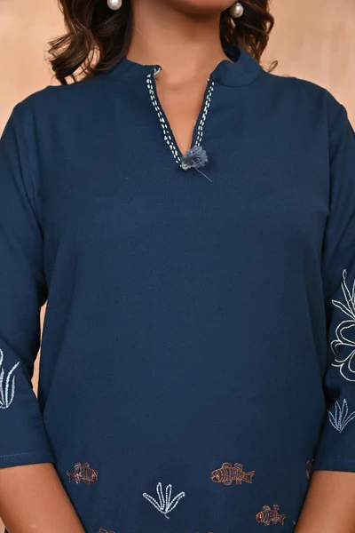Navy Blue Pure Cotton Co-Ord Set with Detailed Handcrafted Embroidery Accents