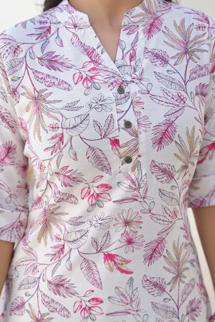 Off White Floral Printed Pure Cotton Straight Kurti