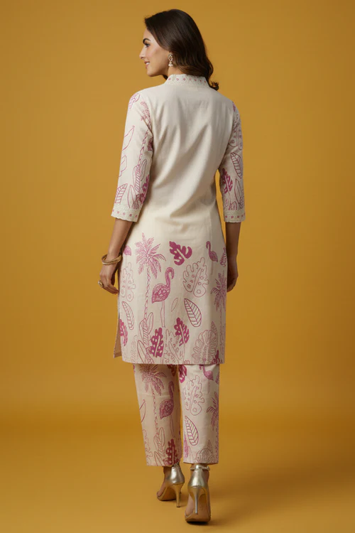 Off White Straight Co-ord in Cotton Flex with Floral Design