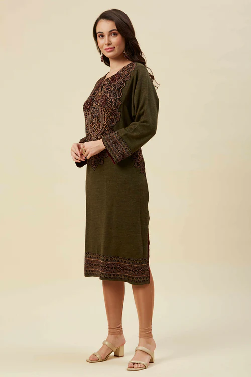 Olive Embroidered Woolen Straight Kurti