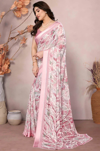 Pink Floral Printed Satin Saree