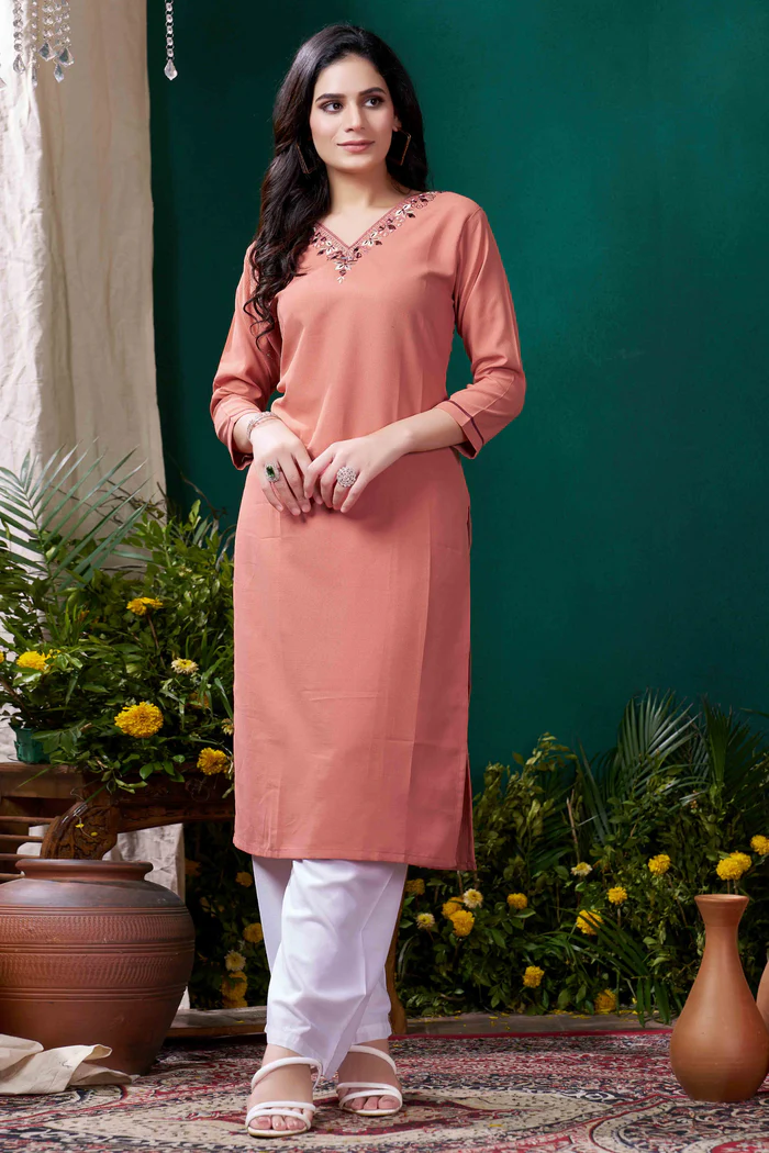Peach Yoke Embroidered Pure Cotton Straight Kurti