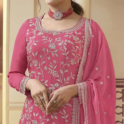 Pink Floral Embroidered Chinon Sharara Salwar Suit