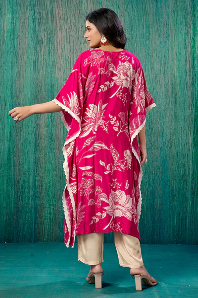Pink Floral Printed Muslin Kaftan Top Bottom Set