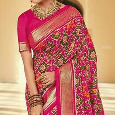 Pink & Green Patola Printed Viscose Saree With Zari Border